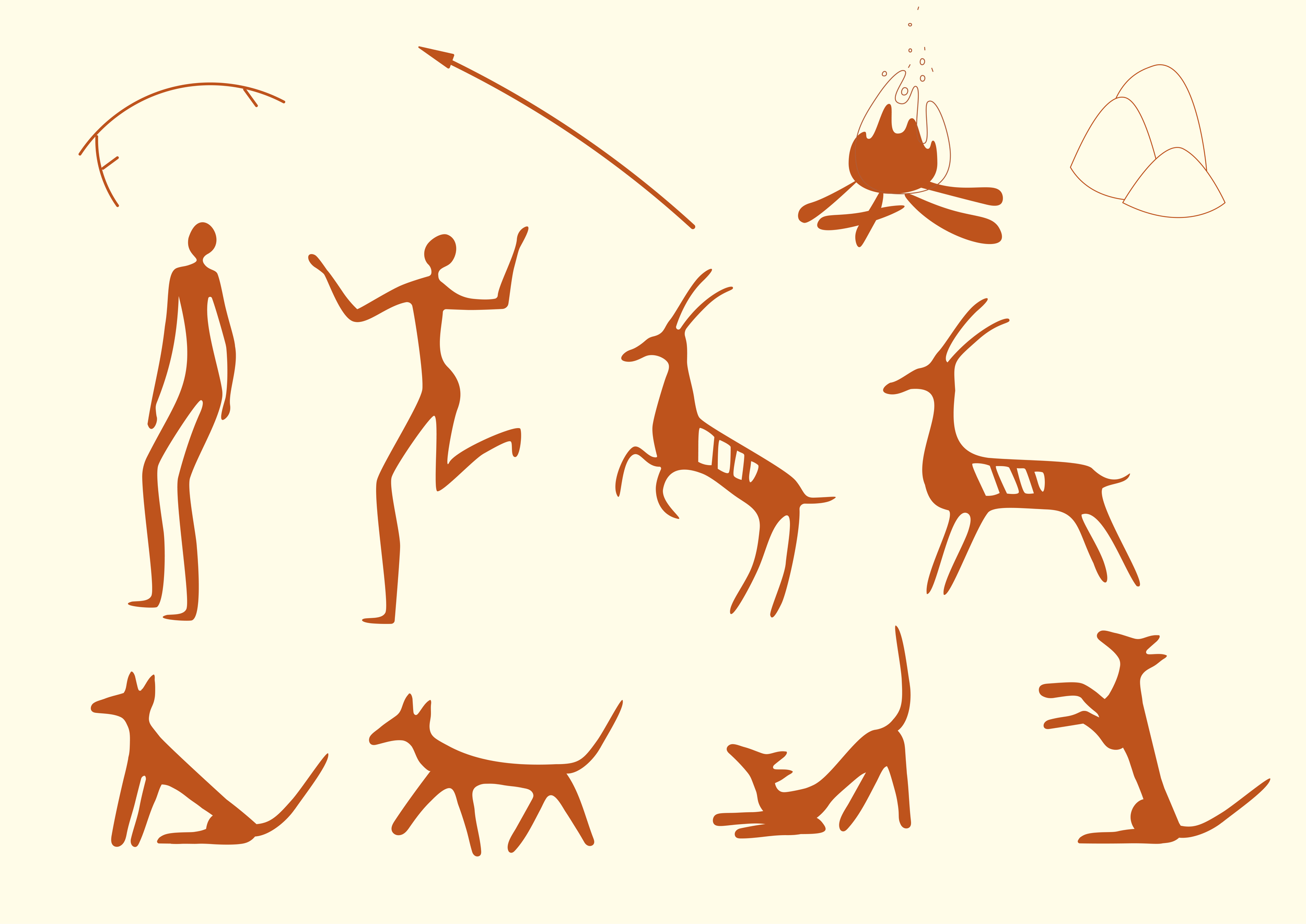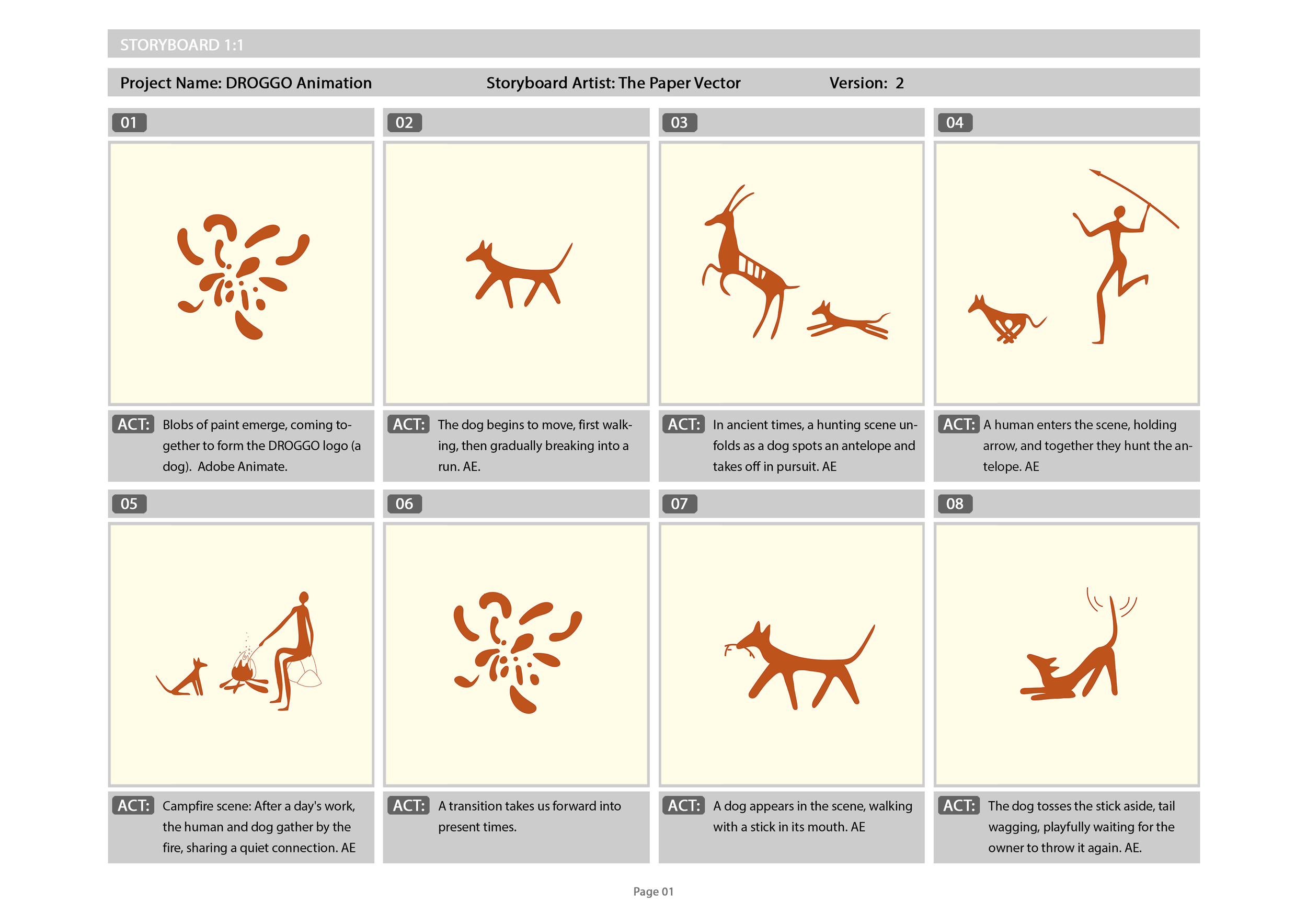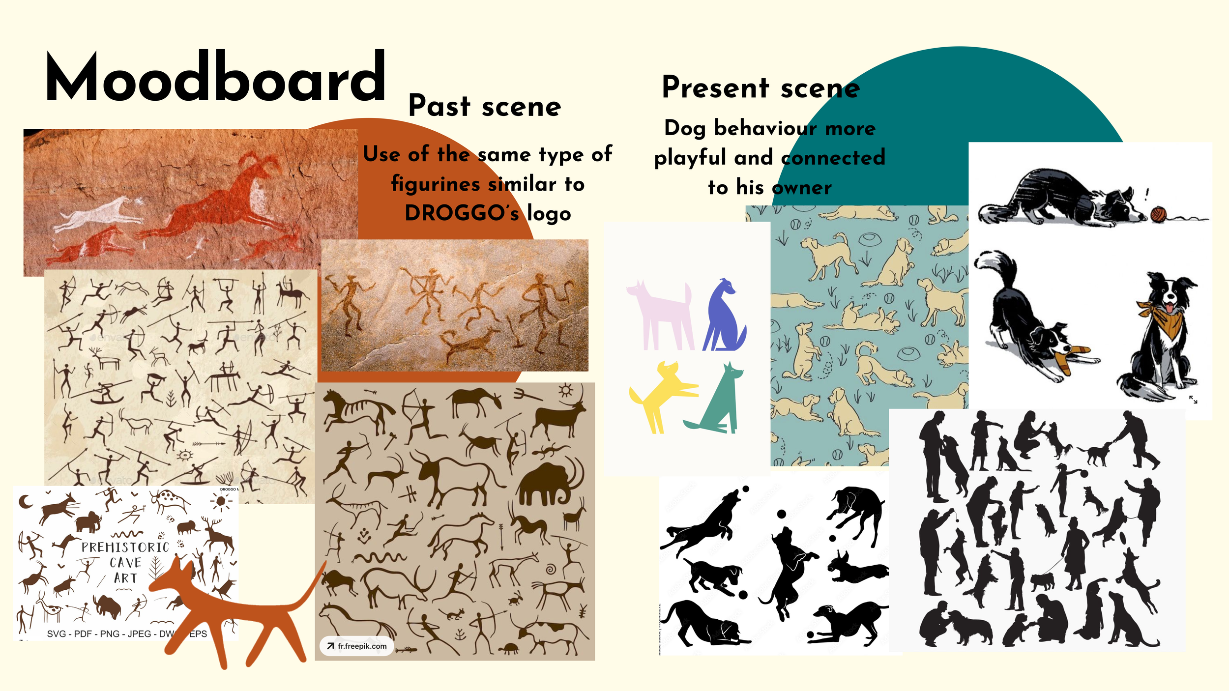 We began by creating a mood board and then developed a storyboard. For inspiration, we explored ancient petroglyphs—images carved into rock surfaces that depict the early bond between humans and dogs. We also drew ideas from contemporary and trending illustrations and animations featuring dogs.